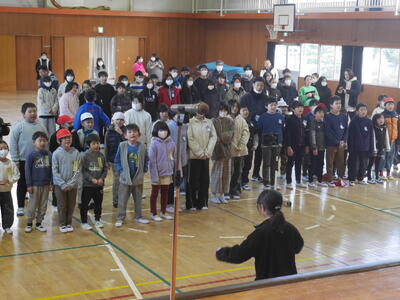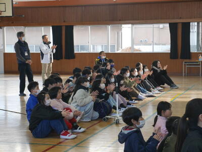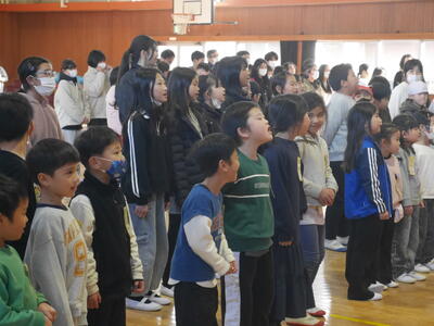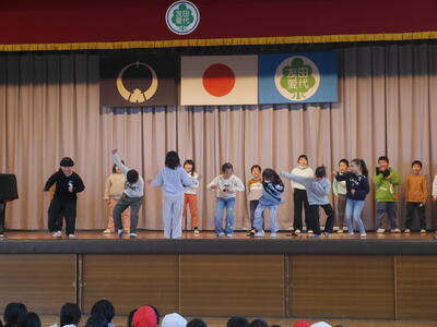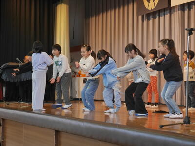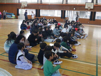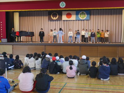 体育館に全学年が集まってきました。オンステージ?えっ、2年生がやるの!?音楽の時間に一生懸命練習してきたんだよね。憧れの4年生をお手本にしながら。