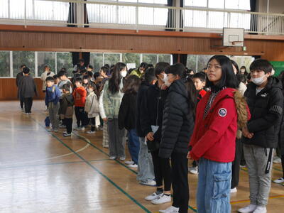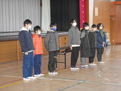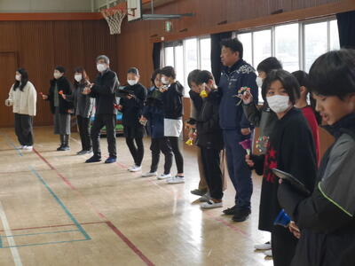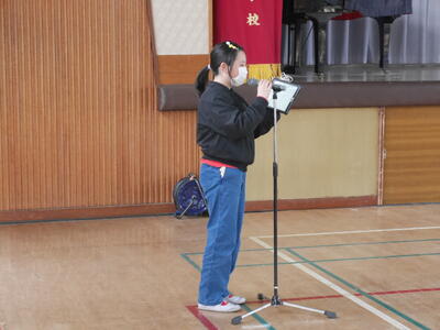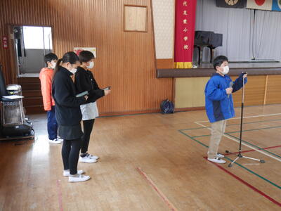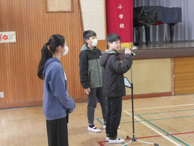今日は冬休み前集会が行われました。終わりかけたそのとき...はい、来ましたよ「ちょっと待ったぁ!」進行は6年生。自分たちだけでこの考えたそうですよ。まずはプレゼンフェスティバルに出場が決まった2チームの意気込みです。
