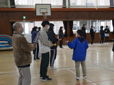 先生方と6年生がみんなを囲みます。手にはハンドベルや鈴。