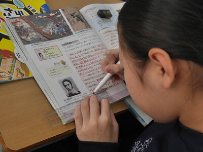 6年生の社会科は明治時代の幕開け。一斉授業形式の中で進みます。