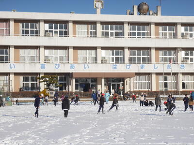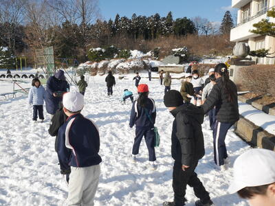 今シーズン2回目の雪は全校の子供たちを校庭に導きました。