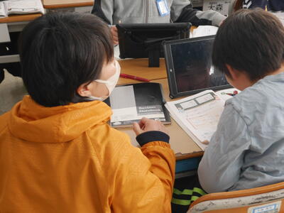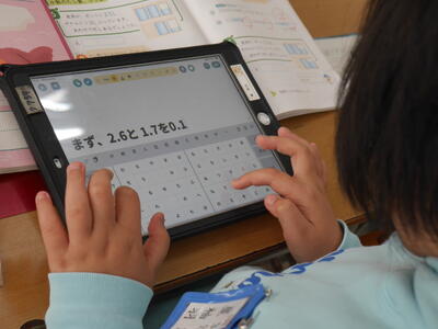 3年生は3校時と4校時にブロック日課を取り入れました。算数の小数の学習です。90分自由進度スタイルですが、先生が各自の進度と理解が確認できるように工夫しています。