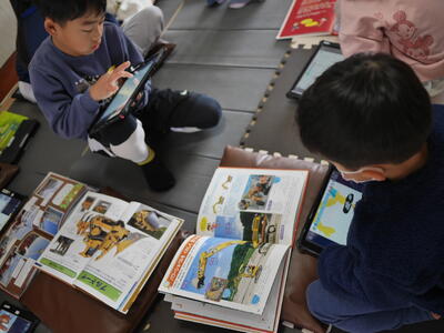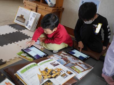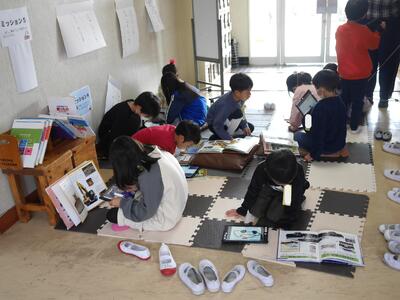 1年生の国語。タブレット片手にミッションを取り入れた自由進度的な学習。まとめる方法も学ぶ場所も自分で選択し自己決定しています。ここは職員玄関。ちょっとしたスペースが学習ゾーンになります。