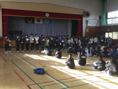 また昼休みに体育委員会が実施した「チャレンジアップ」に参加してくれた児童の皆さんに表彰状が贈られました。