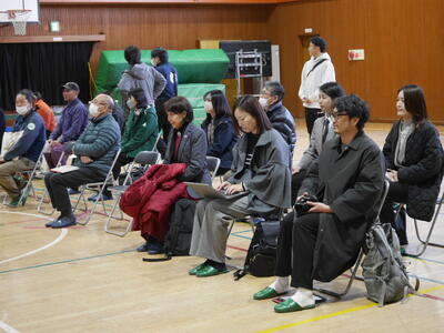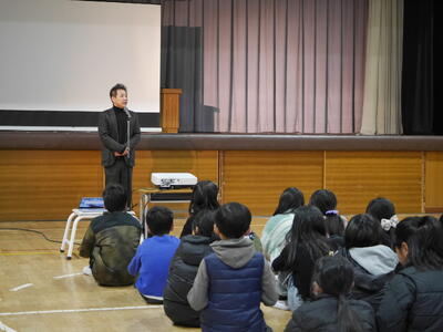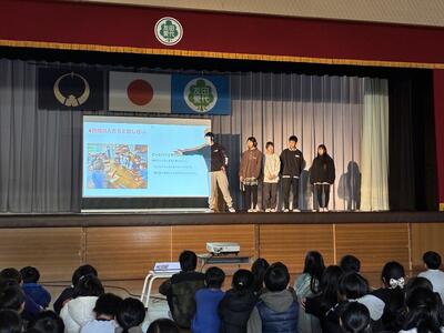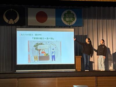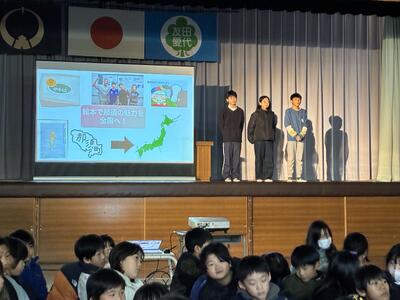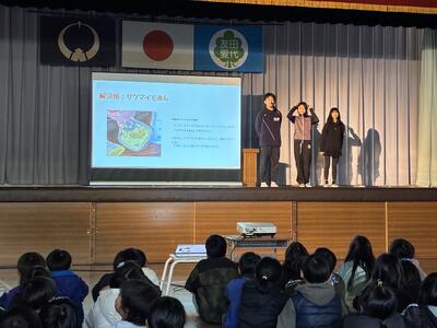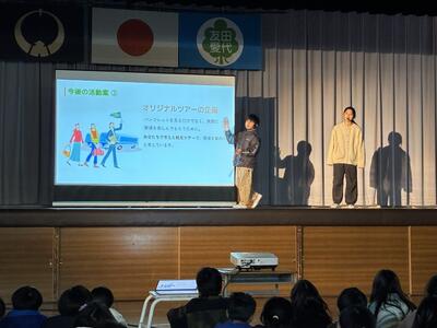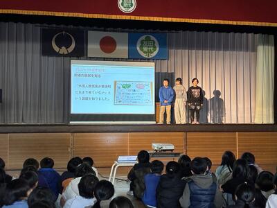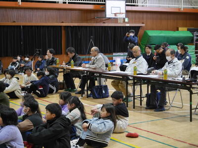 3年生以上の学年を前にして6年生の総合発表会が行われました。会場となった体育館にはDMO(観光地域づくり法人)や協力していただいた地域の皆さん、審査員の方々、リクルート「じゃらん」の皆さんが勢揃い。