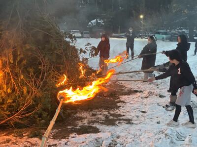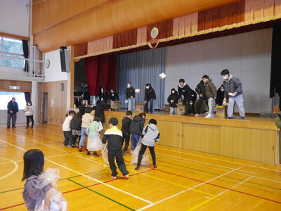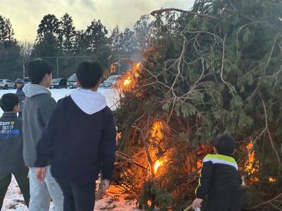 6年生がステージからたくさんのお菓子を威勢よくまきました。大きな袋にいっぱいのお菓子。これは嬉しいですね。雪が残る広場に出て藁や青竹でつくたれたやぐらに火を入れます。
