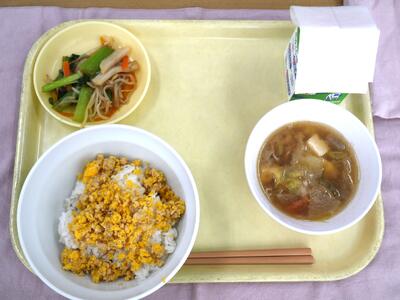 月に一度実施している「オーガニック給食Day」。献立は2色丼、豚汁、ぽんずのあえもの。使われている野菜は農薬を使っていないオーガニック。