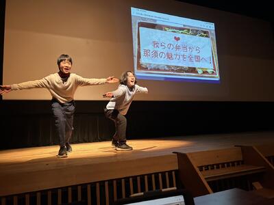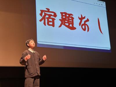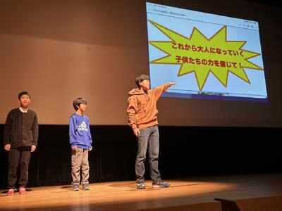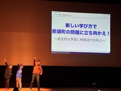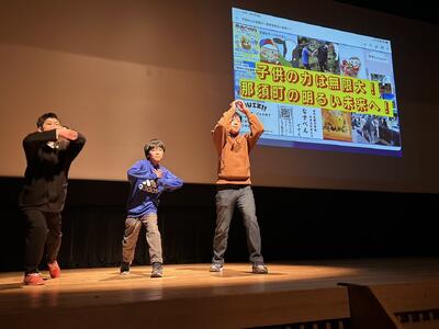 1チーム目は6年生が取り組んでいるDMOとの地域創生プロジェクト「なすべんですよ」チーム。自分たちの取組と現在進行している状況などを含めて素晴らしいパフォーマンスを披露しました。
