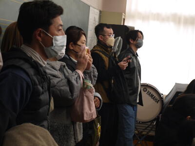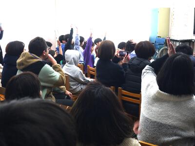 会場には3年生も参加です。大勢の保護者の皆さんに囲まれて緊張....はしてないね。そこが4年生です!