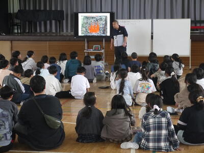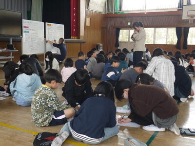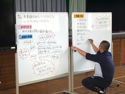 第1次は3年生から6年生の全体オリエンテーション。「なぜ学ぶのか」から始まりました。柱となる「観光」テーマは同じですが、追究する項目は子供たちが選択していきます。