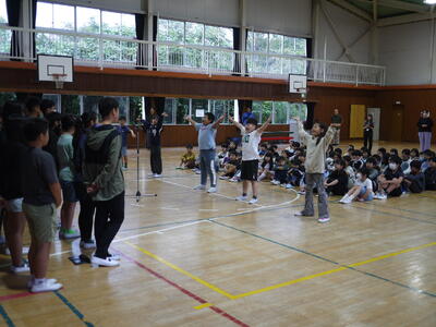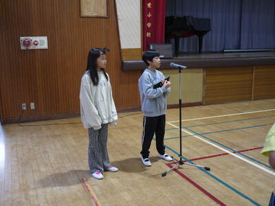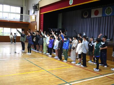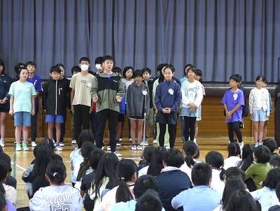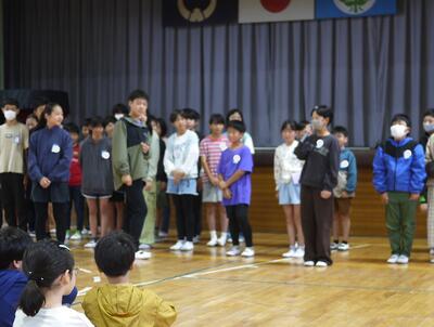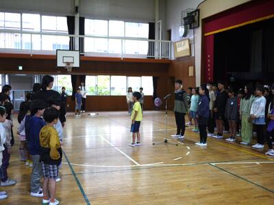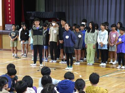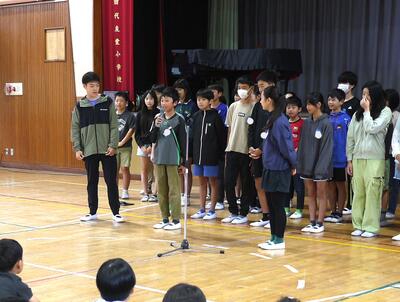 明日行われる那須町陸上競技記録会。5年生、6年生を前にして壮行会が行われました。進行は4年生。「フレー、フレー陸上部!」体育館に応援隊の声が響きます。
