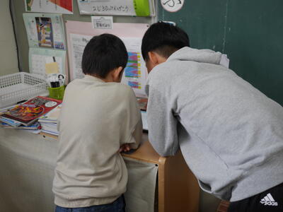 6年生が1年生の教室に自由進度スタイル学習を見学に行きました。6年生はすっかり自由進度スタイル学習を体系化しています。さてさて、1年生はどうかな。