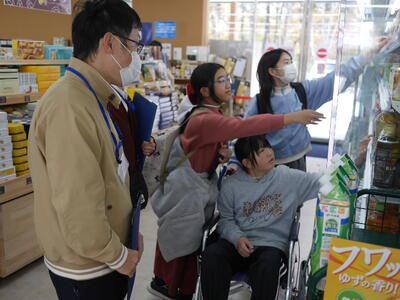 実際に店内も歩きます。「品物が取りやすい位置にあるね」「この商品は取るのが難しいなぁ」目線を車椅子にすることで見えてこなかった社会が見えるようになります。