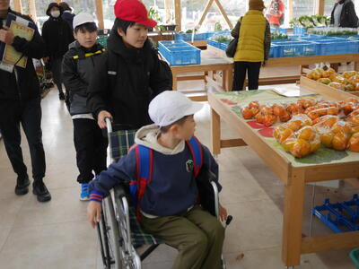 4年生が道の駅友愛の森さんの協力を得て学びを深めます。車椅子の実際を体験します。