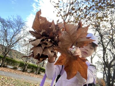 うひぁ~。大きな葉っぱ!これは何に使うのかな。1年生は秋を探検しながらお宝を見つけていきます。これが図画工作とコラボした作品になっていきます。